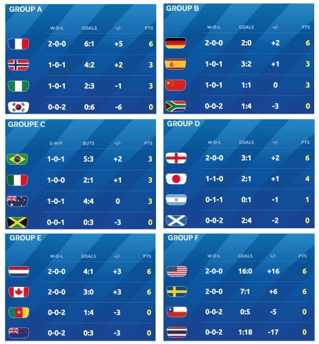 Buts : Marta, Cristiane (Brésil), Foord, Logarzo, Monica (csc) (Australie)Un come-back comme on les aime : surprenant, inattendu et controversé. Le match Australie-Brésil nous a apporté la première montagne russe du Mondial. La soirée semblait pourtant parfaite pour les Brésiliennes. Marta venait d’inscrire (sur penalty) son 16ème but dans l’histoire de la compétition (elle a marqué durant chacune des 5 dernières éditions, un record qui confirme encore plus sa légende). Cristiane a ensuite, de la tête, porté son compteur à 4 réalisations en deux rencontres. 2-0 pour le Brésil. Mais cela n’a pas suffi. Caitlin Foord est allée donner un second souffle aux Aussies juste avant la pause. Pleine d’espoir, la sélection Australienne a rapidement égalisé au retour des vestiaires par le biais de Logarzo, avant de pousser le Brésil à la faute sur une tête contre son camp de Monica. Un but qui a dû être validé par la VAR : Sam Kerr, hors-jeu sur le centre repris dans ses propres filets par la capitaine brésilienne, n’était pas pleinement impliquée dans l’action d’après l’arbitre, et n’était plus hors-jeu au moment de la tête de Monica. Cette décision, justifiée ou non, fera sûrement parler les Brésiliennes longtemps. Longuement critiquées après leur première défaite face à l’Italie, les Aussies se sont relevées grâce à cet incroyable come-back. La capitaine, Sam Kerr, y a d’ailleurs répondu de façon très claire dans une interview d’après match. Traduction : “Il y a eu beaucoup de critiques nous concernant, mais voilà, on est de retour. Vous l’avez dans le …”. Pas de pitié en Coupe du monde.