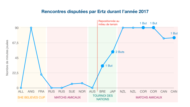 L’année 2017 a été un tournant dans sa vie. D’un point de vue personnel, elle a été rythmée par son mariage avec Zach Ertz, le célèbre joueur de football américain des Philadelphia Eagles (champion du Super Bowl 2018). Mais c’est surtout l’année durant laquelle elle a été élue meilleure joueuse américaine. 2017 n’a pourtant vraiment pas débuté de la meilleure des manières. Son temps de jeu a été considérablement réduit. Elle n’a été titulaire qu’une seule fois en défense centrale lors de la She Believes Cup, foulant la pelouse 13 minutes au total durant les matches amicaux qui ont suivis en juin (c.f. graphique ci-dessous). A cette époque, Jill Ellis a d’abord testé une défense à 3, avant d’essayer de trouver un autre binôme à la charnière qu’elle formait avec Becky Sauerbrunn, laissant la joueuse des Chicago Red Stars sur le banc de touche. “C’était assez bouleversant pour moi comme situation à cette époque” a-t-elle avoué dans le mini portrait vidéo nommé The Journey réalisé par la fédération américaine avant la Coupe du monde. “Mais ca m’a surtout donné du temps pour travailler mon mental et me reconcentrer sur mes motivations.”